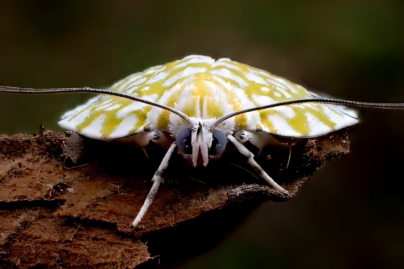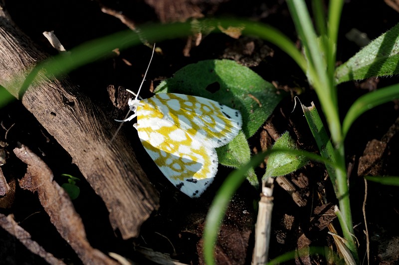 下を向いて歩いていると、黄色い模様の綺麗な蛾を見つけた。こういう蛾を見ると興奮してレンズを向けたくなる。アミメリンガという蛾で幼虫はクルミの葉を食べるという。なるほど見つけたのは大きな鬼グルミの木の足元だった。毎年このあたりに発生しているのかも知れない。