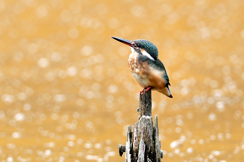 台風のおかげで池の水は潤沢になったけれど、一難去ってまた一難。池の表面はアカマクミドリムシという微生物の仕業による紅い膜で一面覆われ、カワセミは水中の魚を捕捉することが出来ない。これじゃダイビング漁は無理だ。紅い水面を呆然と眺める哀れ若いカワセミ(♀)。でもそれほど心配する事はない。ちょっと風が吹けば紅いベールは岸に流され、澄んだ水が顔を見せるから、きっと。