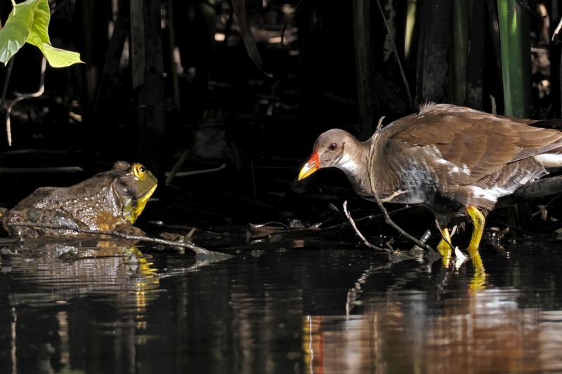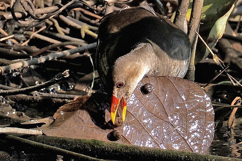 バンは漸く朝日が射しこんできた池の畔で朝食を摂っていた。食べているのはほとんどタニシだ。水に浸った葛の枯れ葉をひっくり返し、葉の裏に付着したタニシを食べていた。ちゃんと味わってないようだ。ビタミン剤を飲むようにように丸呑みしている。この分だともう胃の中はタニシでざっくざくだろう。硬い物ばかりでおなかを壊しはしないだろうか。さんざんタニシを食べた後は、シメに水藻をお蕎麦のようにすすっていた。