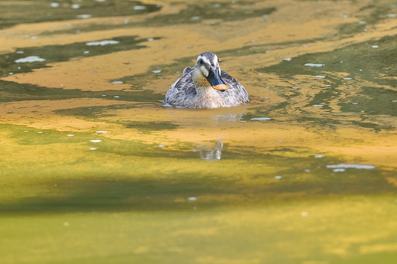 猛暑で大量に発生したプランクトンたちは、水位の低下とともに濃縮されて漂い、渡る風がマーブリング(墨流し)のようなアートを水面に描いた。
