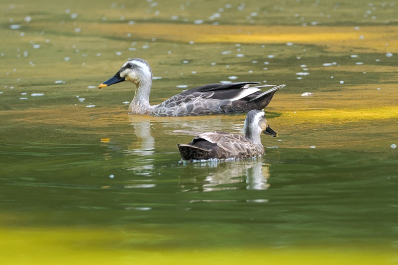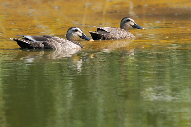 池の水が少なくなってもカルガモのカップルはしぶとく池に残っていた。かえって食糧は豊富なのかもしれない。