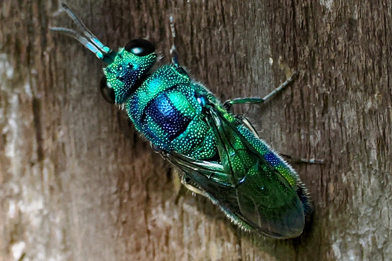 直射日光を浴びながら、瓜久保の家の外壁をせわしなく這い回っていた、毎度おなじみのミドリセイボウ。カメラを向けると、その気配を察したのか動きが止まった。そして後ろ足を器用に使って、翅をからげるように体の下の方に巻き込むと、美しいお尻半分が露出した。それは明らかに人を意識した悩殺ポーズだった。かわいいふりしてあの子、わりとやるもんだねと♪思った。ミドリセイボウは翅を背中に戻し、またいつもと同じように歩き始めた。それは一瞬の出来事だったが、年取ったうぶなカメラマンは心奪われ、いつまでも興奮が冷めなかったらしい。