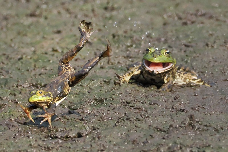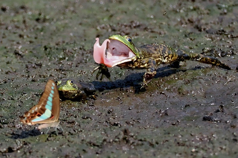 アオスジアゲハが微妙に翅をばたつかせて吸水しているところに、大小2匹のウシガエルがゆっくりと近づいてきた。奴らは少しでも動いているモノを見れば食べ物だと思って近寄って来る。そして大きい方が狙いを定めてアオスジアゲハに飛びかかった。しかし目測を誤り、ターゲットのはるか手前に口を開けたまま落下した。これをバックアップしようと、今度は小さい方が思い切りジャンプしたが、大谷投手のフォーシームに対するバッターのように、タイミングがまったく合わず空振り。アオスジアゲハはかすり傷ひとつ負う事もなく飛び去って行った。