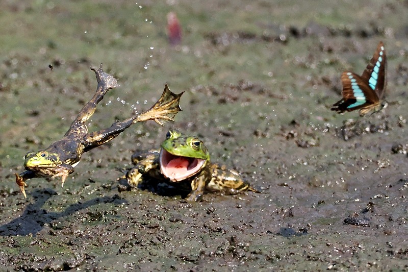 干潟のようになった池の岸では、ウシガエルたちが蝶やトンボを相手にこんなことを繰り返している。でもウシガエルがうまく獲物を仕留めたためしが無い。