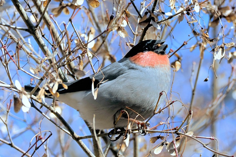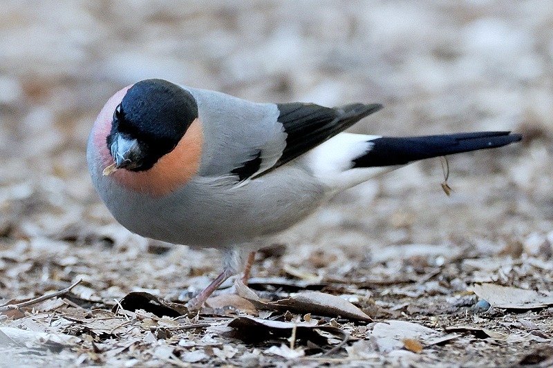 ここのところ古民家の裏庭にちょくちょく遊びに来ている噂のウソ(鷽)。だいぶ人馴れしているようで、アオジのように地べたを跳びながら、落ちている何かの種を啄んでいた。そしてたらふく食べた後は筧に流れる水を飲んだりして、余裕だ。そして今度は枝に飛び乗って乾燥したカエデの種子を食べたりして。そして時々自慢の口笛を披露して。集まったフォトグラファーたちを楽しませてくれた、2ペアのウソ。